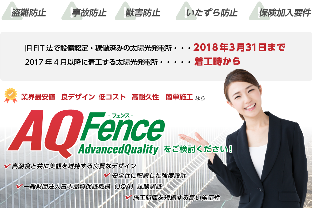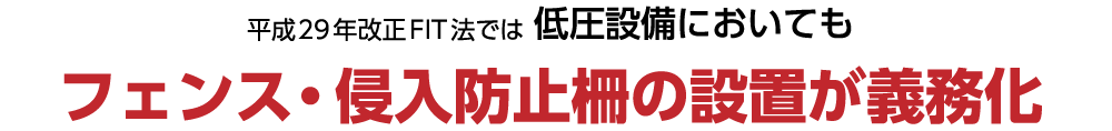 改正FIT法により低圧産業用発電所における、盗難リスクの軽減、子供の侵入による感電等の事故防止、いたずら等による発電所稼働停止の防止などを目的としてフェンスなど侵入を防止する柵の設置が義務づけられました。