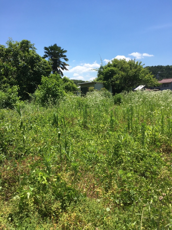 草刈り、抜根、小さく遠くに写る小屋の解体を行い、造成していきます。