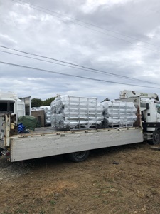 先日 1.4MWのシェアリングの架台搬入がスタートしました。まだ基礎部分だけですが・・