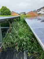写真はアレイ間に防草シートは貼ってあるものの、隙間から雑草が