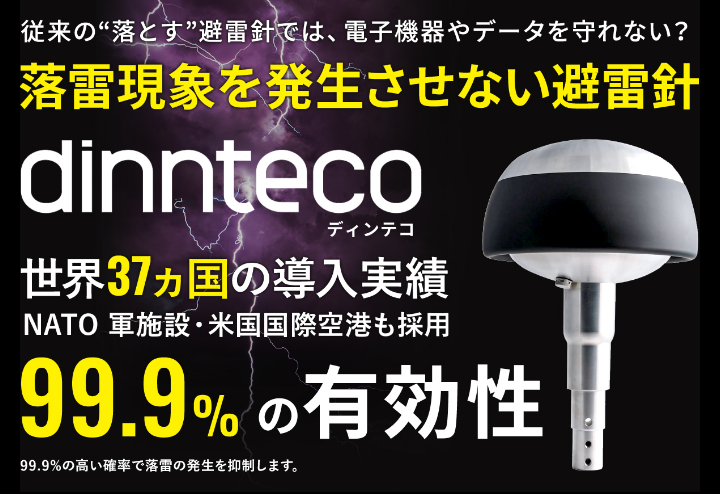 事業の概要 エネテクトレーディングでは、従来の避雷針では避けられない雷サージのダメージから、建物・施設・設備を保護するための避雷針「dinnteco-100plus(ディンテコ100 プラス)」を取り扱いしております。 雷を"落とす"従来の避雷針から、落雷現象を"発生させない"避雷針へ。 シミュレーションプランのご提示から避雷針の設置まで、エネテクトレーディングにお任せください。 詳細はこちら 事業内容 不動産事業 太陽光事業 太陽光発電システム部材 重機アタッチメント 防草シート 避雷針設備事業 各種施工支援 太陽光発電システムO&M ソラパト