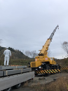現場までの乗り入れが難しく今回はクレーンでの釣り上げを行い、部材搬入となりました。